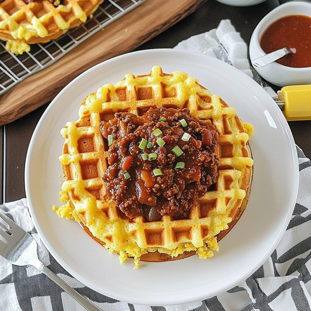Imagine sinking your teeth into a fluffy, cheesy cornbread waffle topped with a hearty chili that dances on your taste buds like a salsa party. This delightful combination of flavors