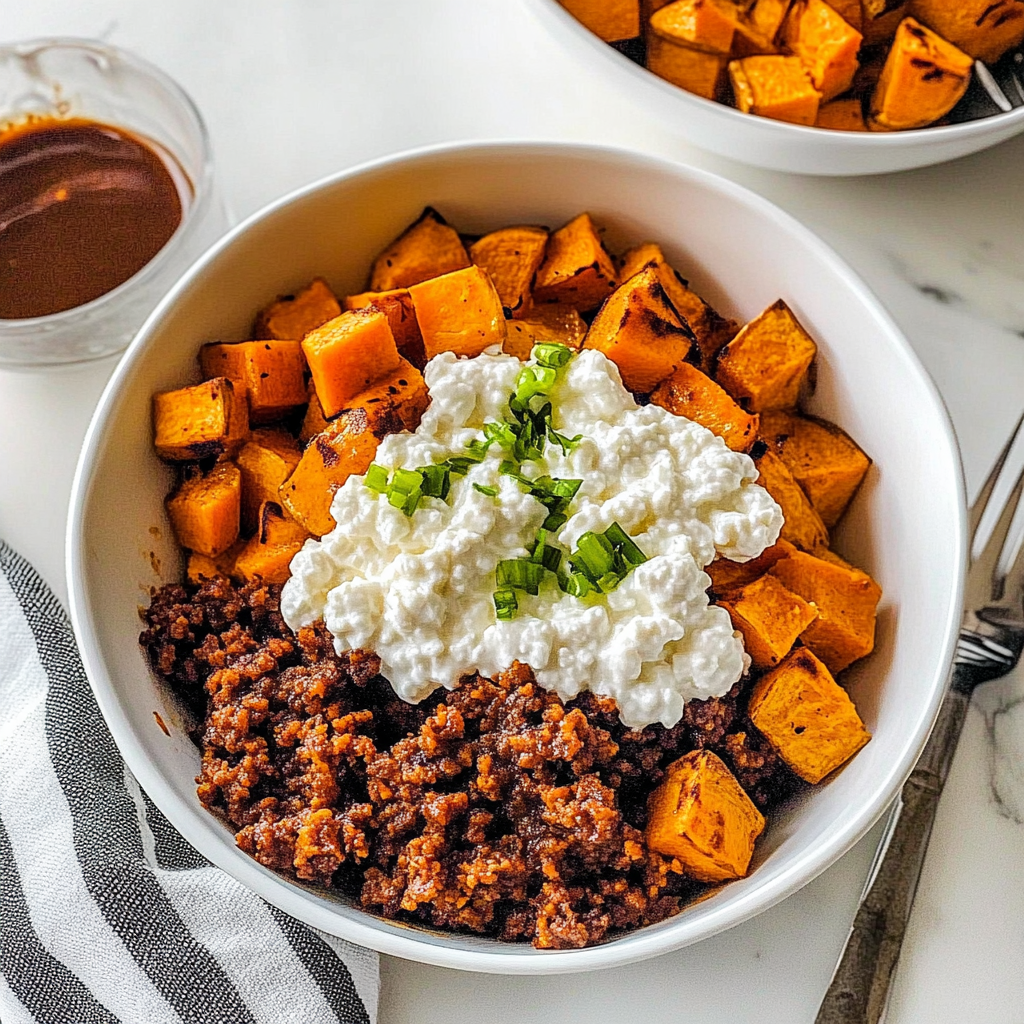 Sweet potato cottage cheese bowl is like a cozy hug on a chilly day. Imagine the creamy texture of smooth cottage cheese marrying the sweet, earthy notes of roasted sweet