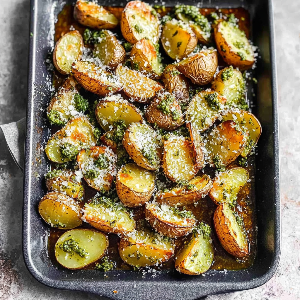 Imagine biting into a crispy potato, golden and perfectly seasoned, followed by the fresh burst of pesto and the rich, nutty flavor of Parmesan. The aroma wafts through the kitchen,