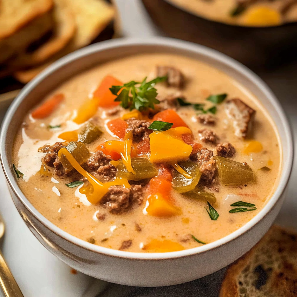 The rich, creamy aroma of Crockpot Cheeseburger Soup wafts through your home, making you feel like you’ve just stepped into a diner filled with cozy comfort. Imagine the warmth of