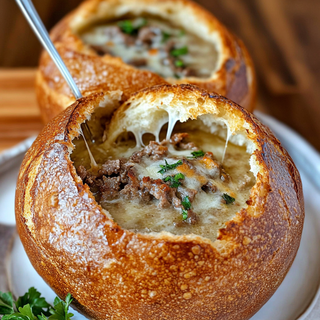Rich, creamy, and oh-so-satisfying, Philly Cheesesteak Soup in Bread Bowls is the ultimate comfort food experience. Picture this: a delightful bowl made of crusty bread filled to the brim with