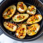 Indulge in the crispy, cheesy goodness of air fryer potato skins! These delectable bites feature perfectly golden shells topped with gooey cheese, crispy bacon bits, and vibrant green onions. Ideal for game nights or casual gatherings, this easy-to-make recipe guarantees a crowd-pleasing snack that’s bursting with flavor.