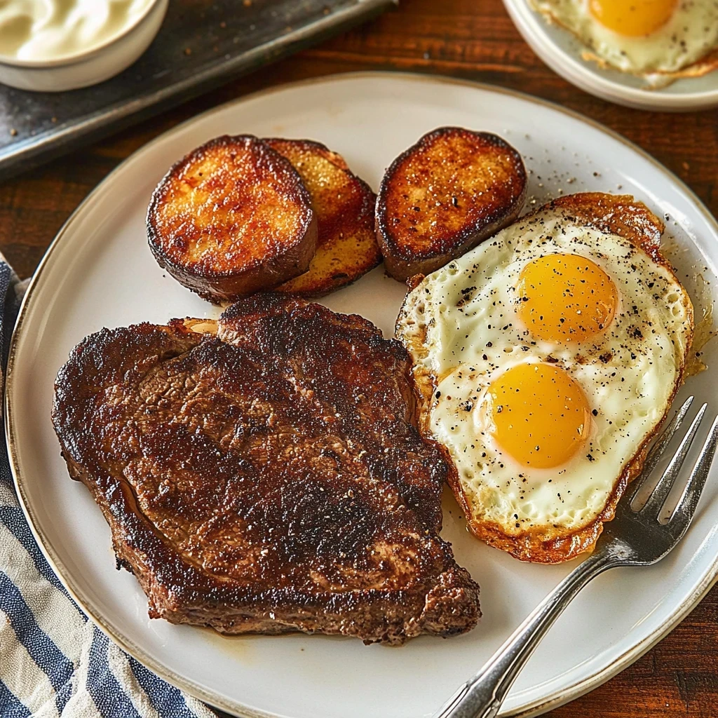 1 tsp salt (to taste): Adjust the salt to your preference; it enhances the natural flavors of the steak and eggs.