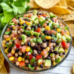 Cowboy caviar includes black beans, corn, tomatoes, bell peppers, and avocado. For more inspiration, check out this Avocado Chicken Salad recipe.