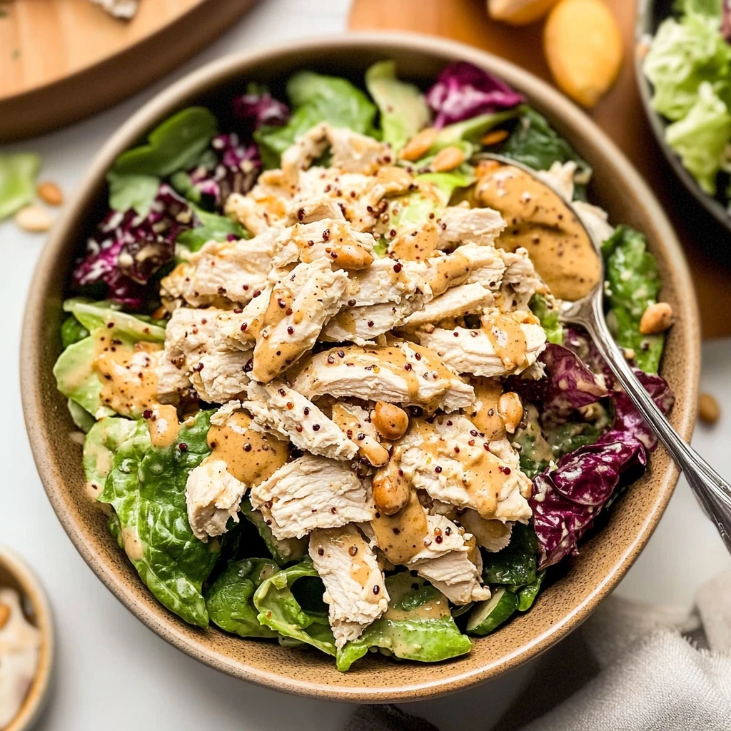 A vibrant salad featuring juicy chicken, crisp greens, and a sweet and tangy honey mustard dressing, perfect for picnics or cozy dinners.