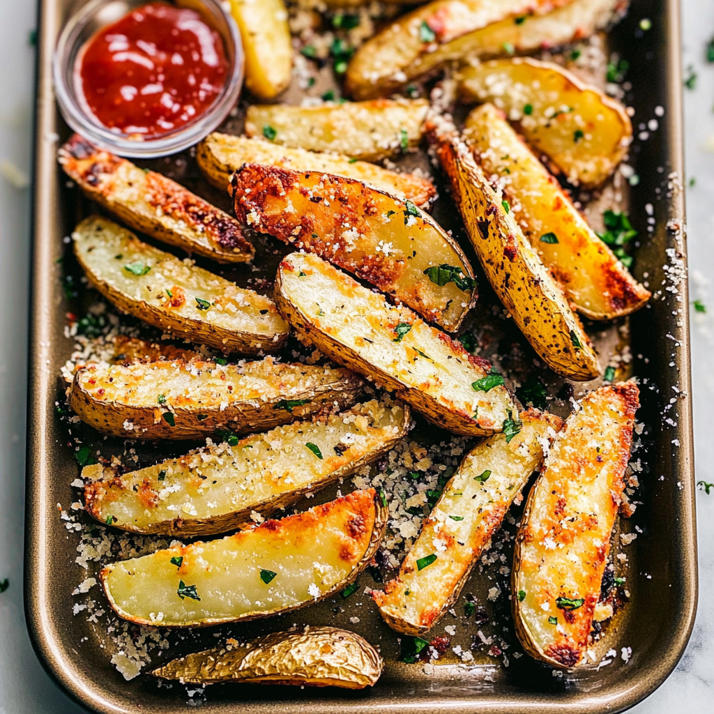 Keywords: - For extra crispiness, soak potato wedges in water for 30 minutes before seasoning. - Feel free to substitute Parmesan with cheddar or add spices like paprika for a kick.