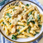 - In a large bowl, combine cooked pasta with sautéed chicken and pour in the creamy sauce. Stir gently until well coated.