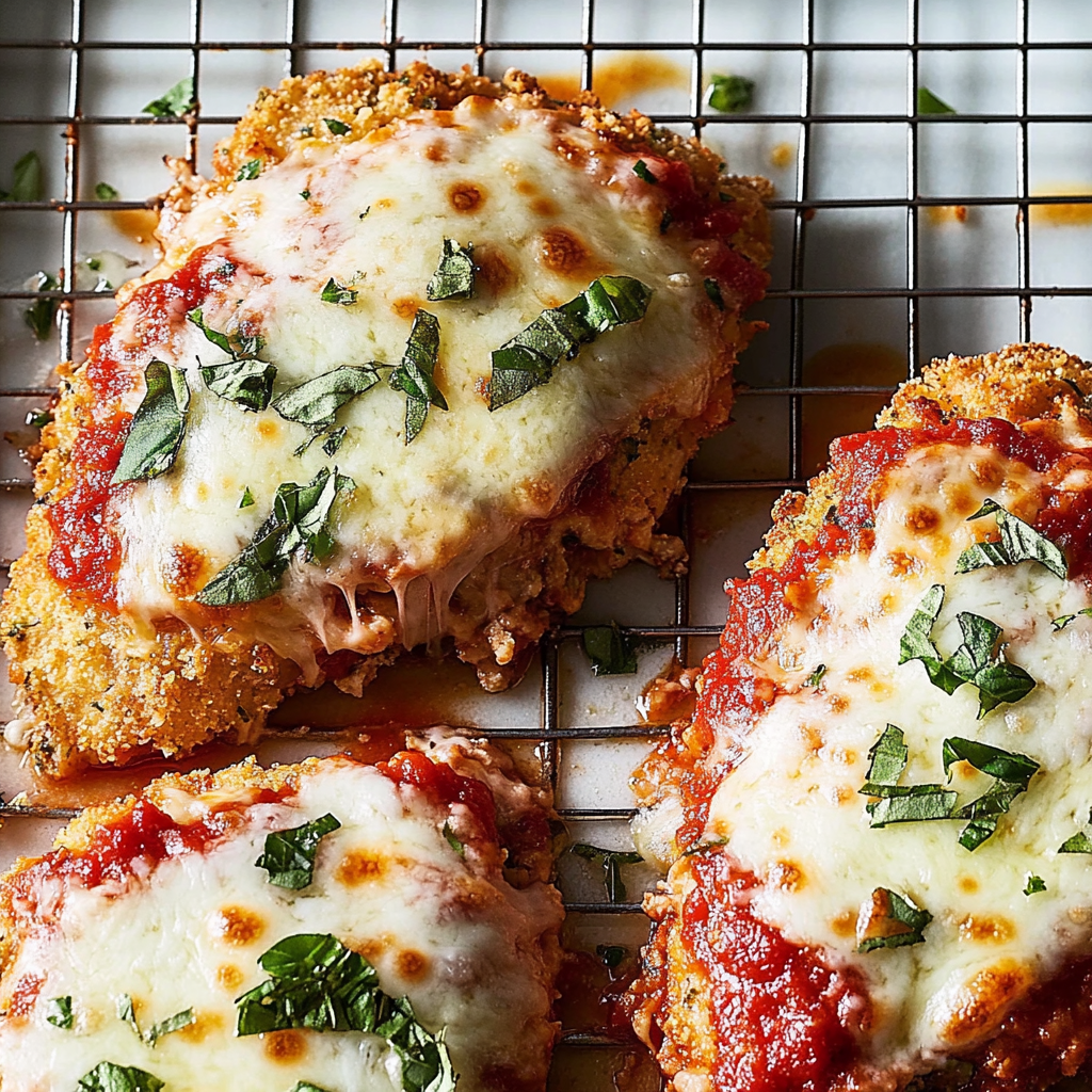 Add Marinara Sauce and Cheese: Once fried, place chicken on the baking sheet. Spoon marinara sauce over each piece and top generously with shredded mozzarella cheese.
