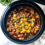 Combine Ingredients in Slow Cooker: Transfer your beef mixture into a slow cooker. Add in canned tomatoes (with juices), rinsed beans, corn, and stir everything together like you’re creating a culinary masterpiece.